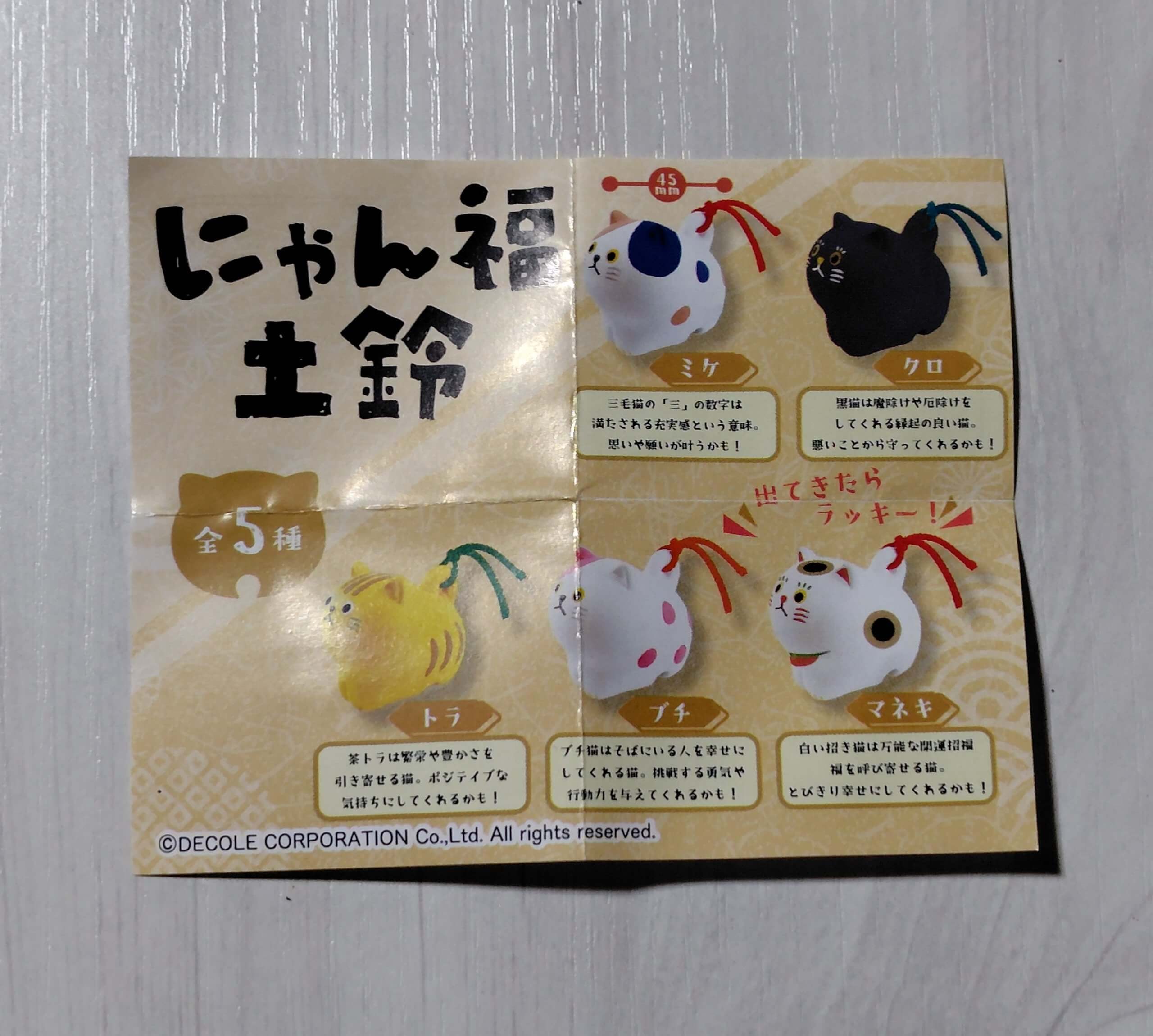それは「にゃん福土鈴」全5種(ミケ・くろ・トラ・ブチ・マネキ)です。1回400円。ちょっと高いかな、と思いましたが、どれが出てもハズレなし。やってみました。