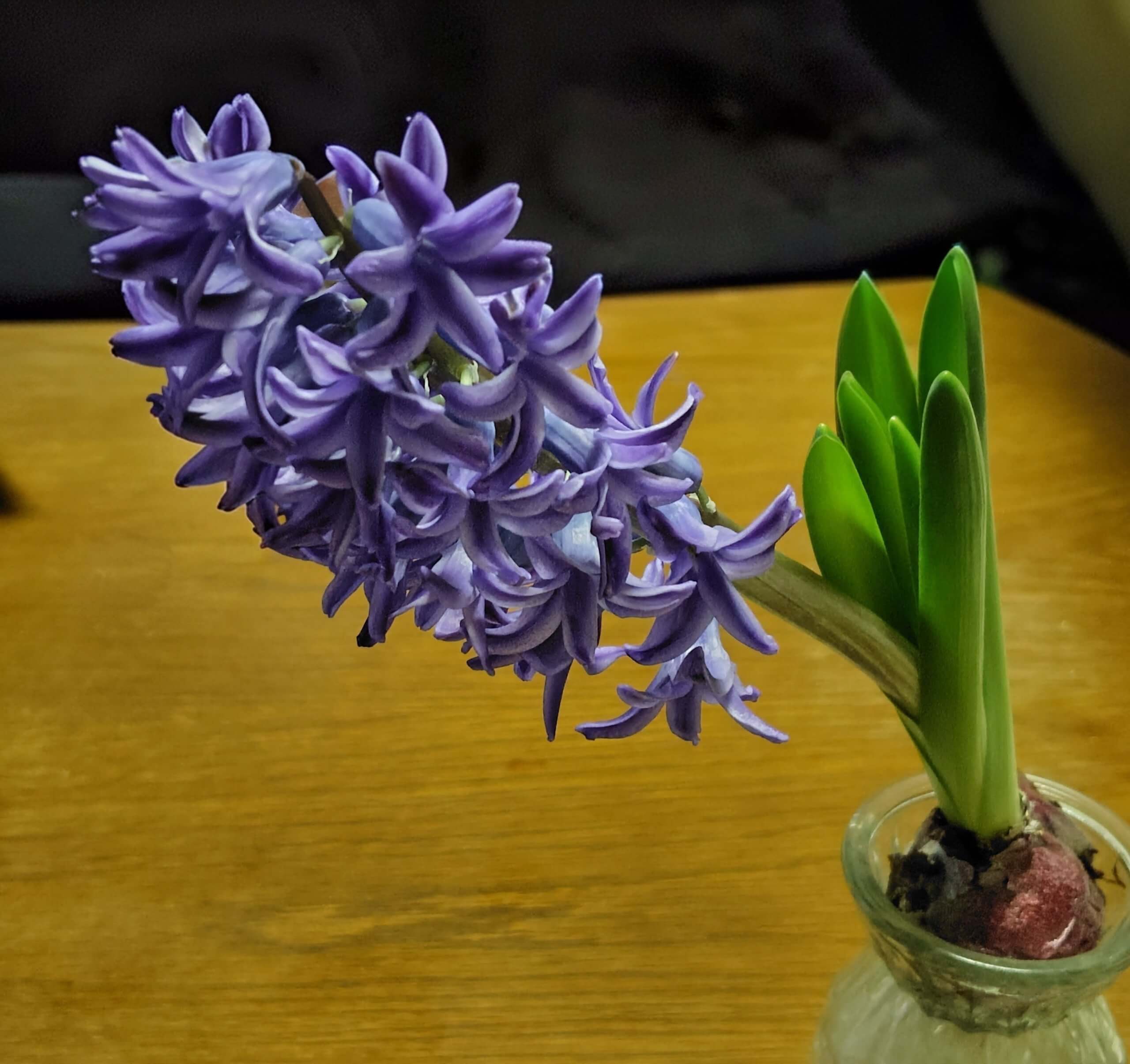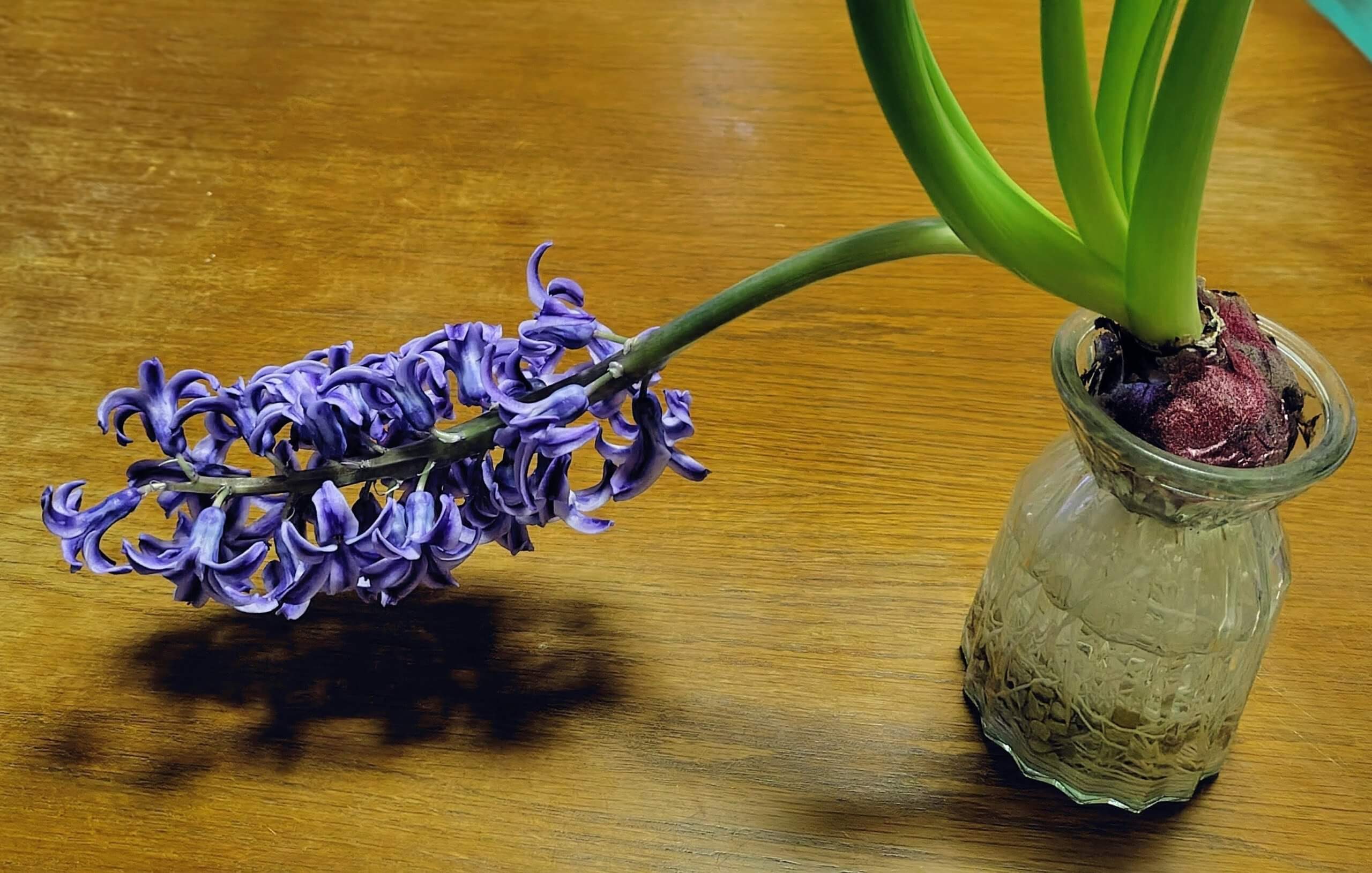 そういえば去年もヒヤシンスを1つだけ育てたのですが、やっぱり茎が斜めに伸びてしまいました。